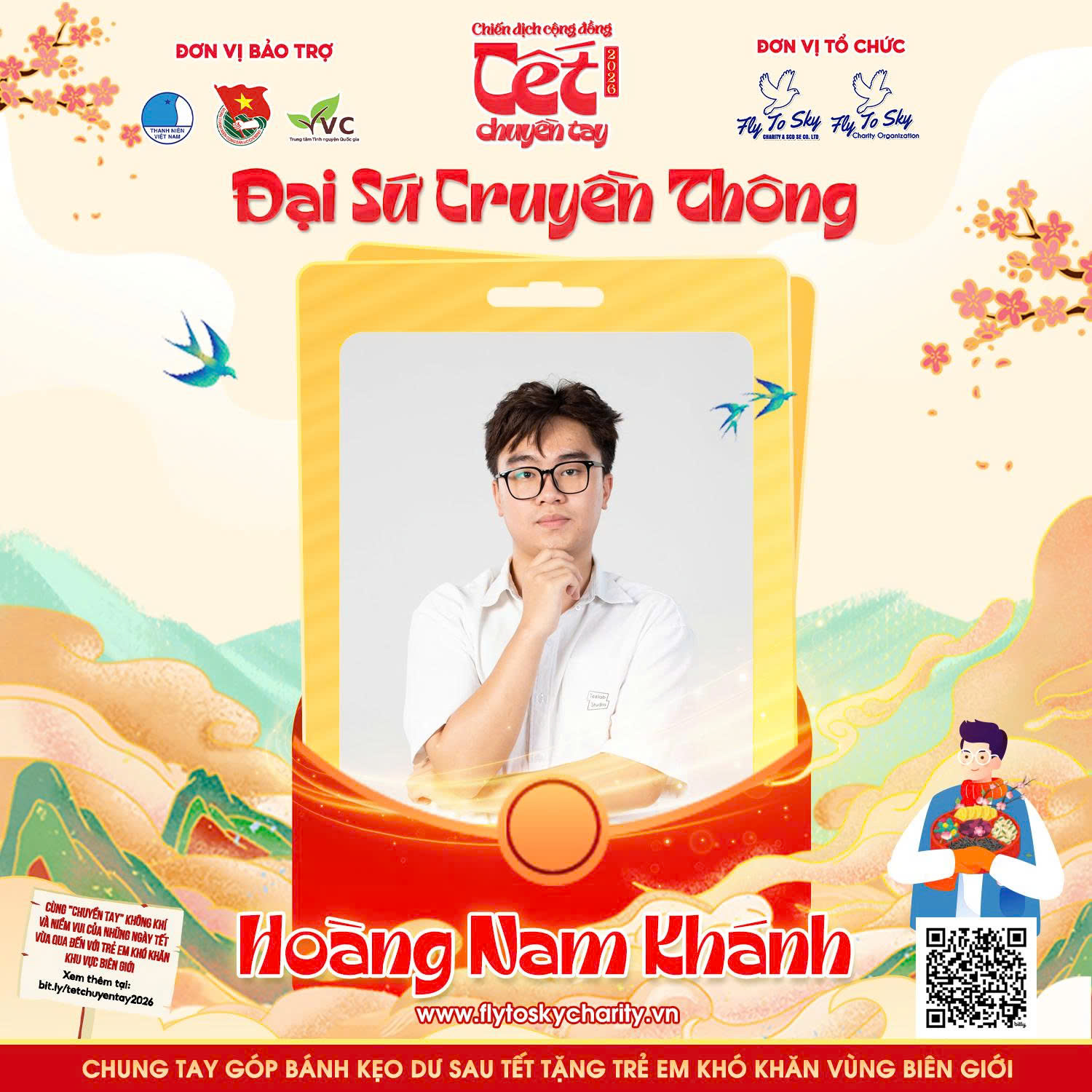 Tết chỉ thực sự đủ đầy khi niềm vui được nhân lên bằng sự sẻ chia. Trên hành trình mang những điều tử tế lan tỏa khắp cộng đồng trong không khí mùa Xuân, chiến dịch cộng đồng “Tết chuyền tay” năm 2026 trân trọng giới thiệu Đại sứ Truyền thông Sinh viên Hoàng Nam Khánh - một gương mặt trẻ đại diện cho tinh thần trách nhiệm và khát vọng cống hiến của thế hệ sinh viên hôm nay.