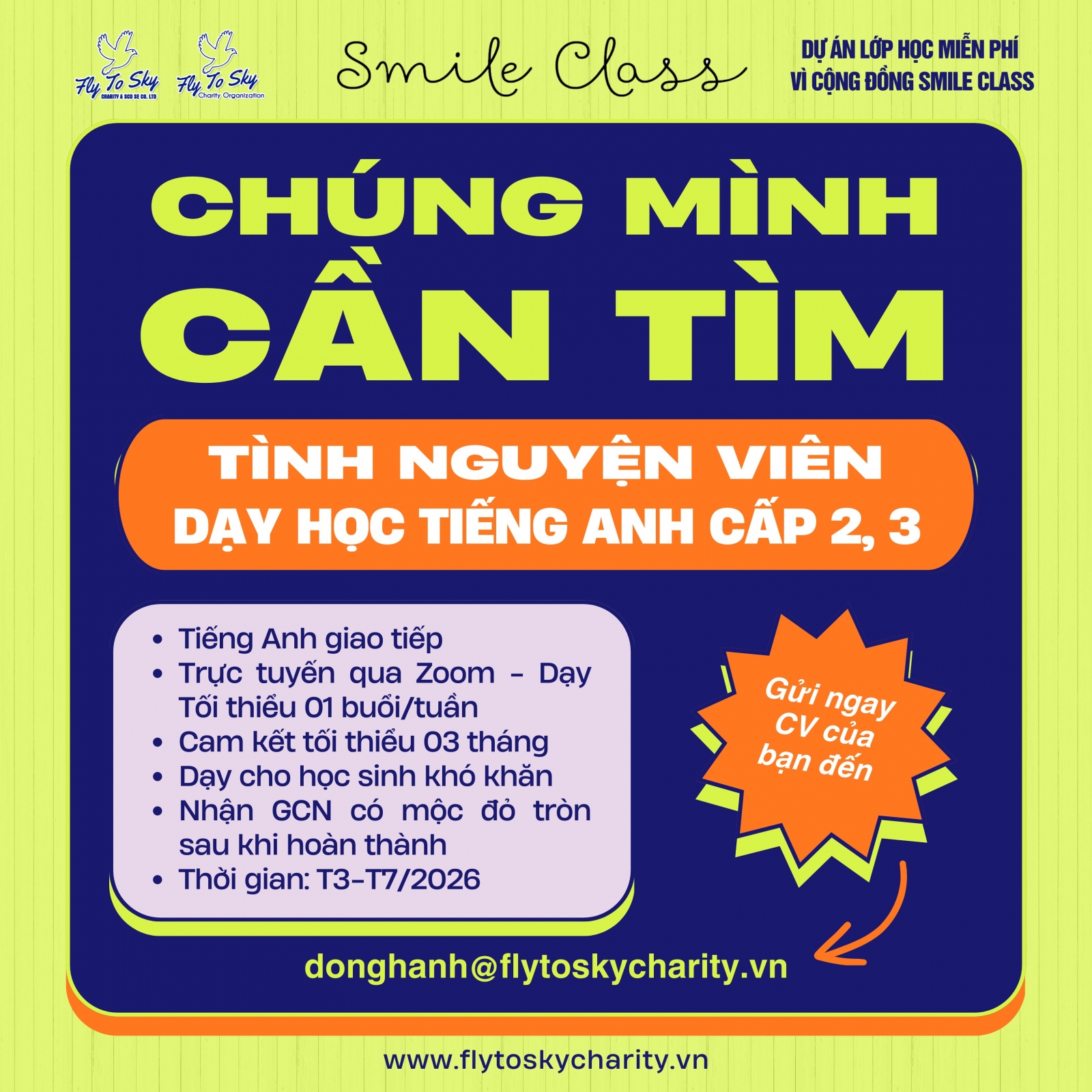 Ứng viên chuẩn bị CV và Cover Letter (nêu rõ kinh nghiệm giảng dạy, trình độ tiếng Anh và khung thời gian có thể tham gia giảng dạy) và gửi về email donghanh@flytoskycharity.vn.