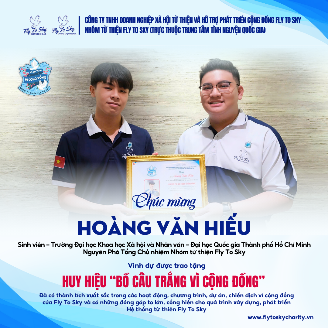 4. Anh Hoàng Văn Hiếu - Sinh viên – Trường Đại học Khoa học Xã hội và Nhân văn – Đại học Quốc gia Thành phố Hồ Chí Minh, Nguyên Phó Tổng Chủ nhiệm Nhóm từ thiện Fly To Sky; Là cá nhân từng giữ nhiều vị trí chủ chốt tại Hệ thống, tham gia Fly To Sky từ khi còn là học sinh THPT; Danh hiệu Tình nguyện viên xuất sắc năm 2023, 2024; Vinh dự được nhận 03 Giấy chứng nhận của Trung tâm Tình nguyện Quốc gia và 08 Giấy chứng nhận/Giấy khen của Fly To Sky, đạt nhiều giấy khen của các địa phương.