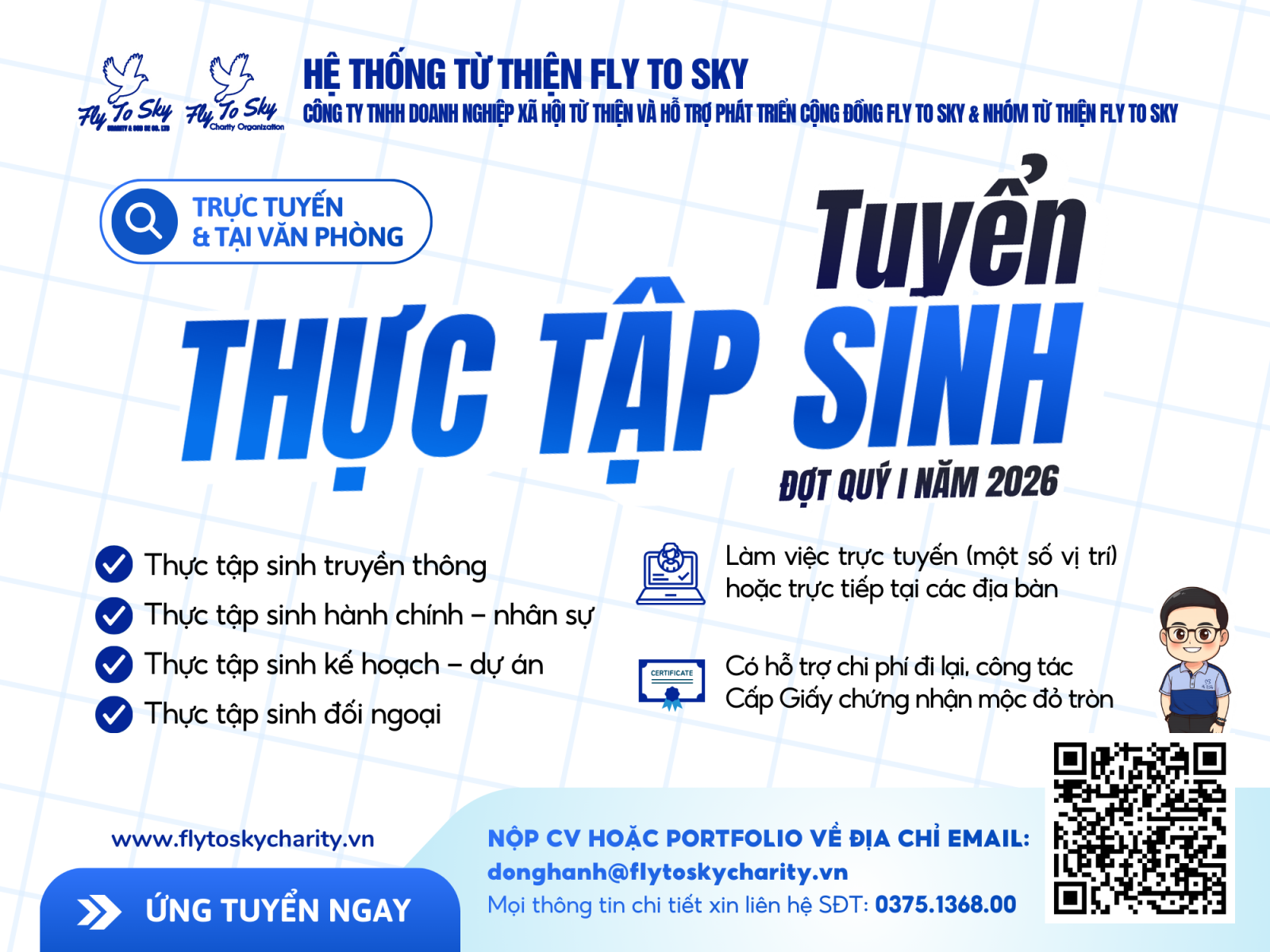 Công ty TNHH Doanh nghiệp xã hội từ thiện và hỗ trợ phát triển cộng đồng Fly To Sky (DNXH Fly To Sky) thông báo tuyển Thực tập sinh (đợt Quý I/2026) nhằm đảm bảo công tác vận hành, tổ chức các hoạt động cộng đồng, cụ thể như sau: